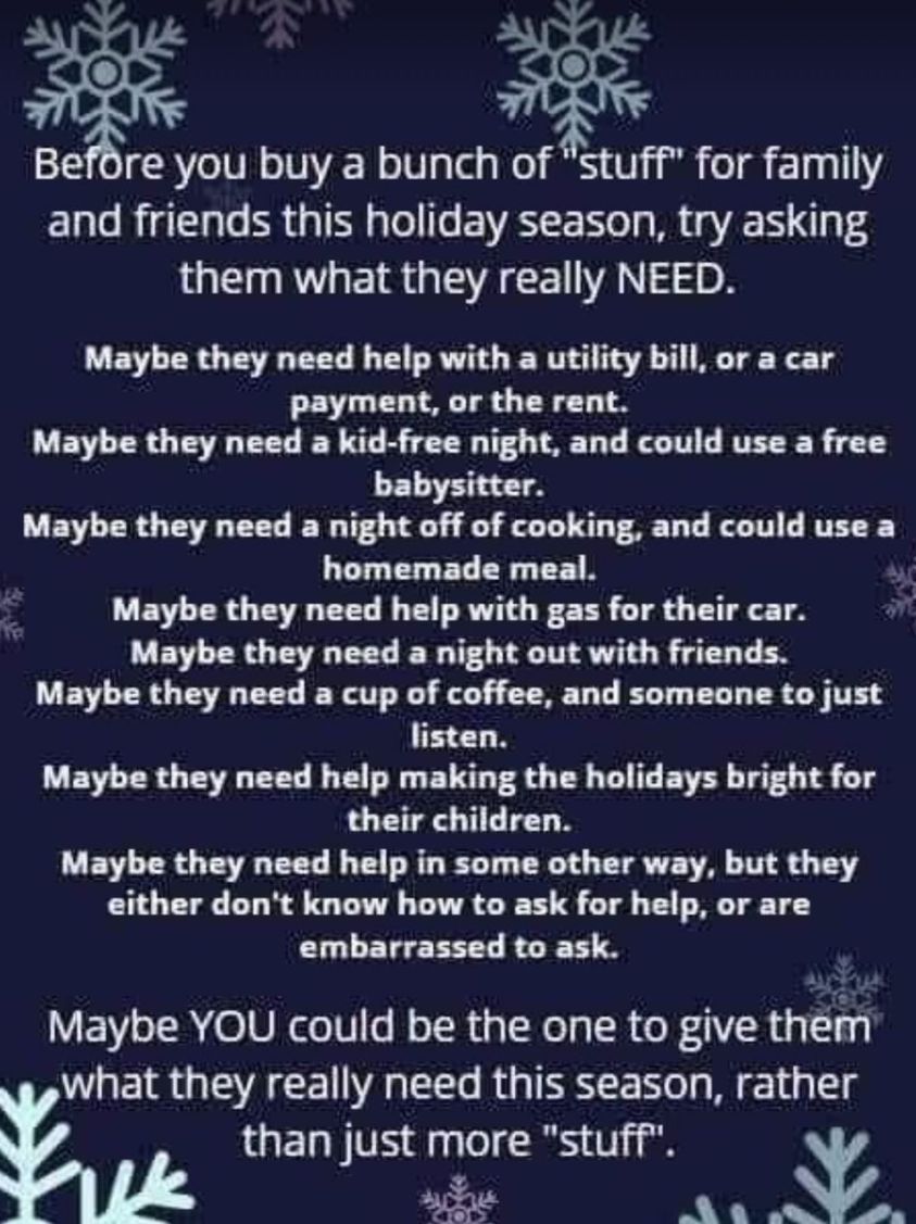 I know I have said this before, but before you buy more “stuff’’ for your family and friends for Christmas, why not consider if they really need it?